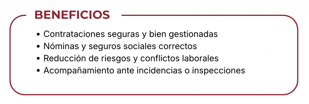 Te ayudamos con la gestión laboral de tu empresa: contratos, nóminas, altas y bajas, normativa y asesoramiento para que cumplas sin problemas y cuides a tu equipo.